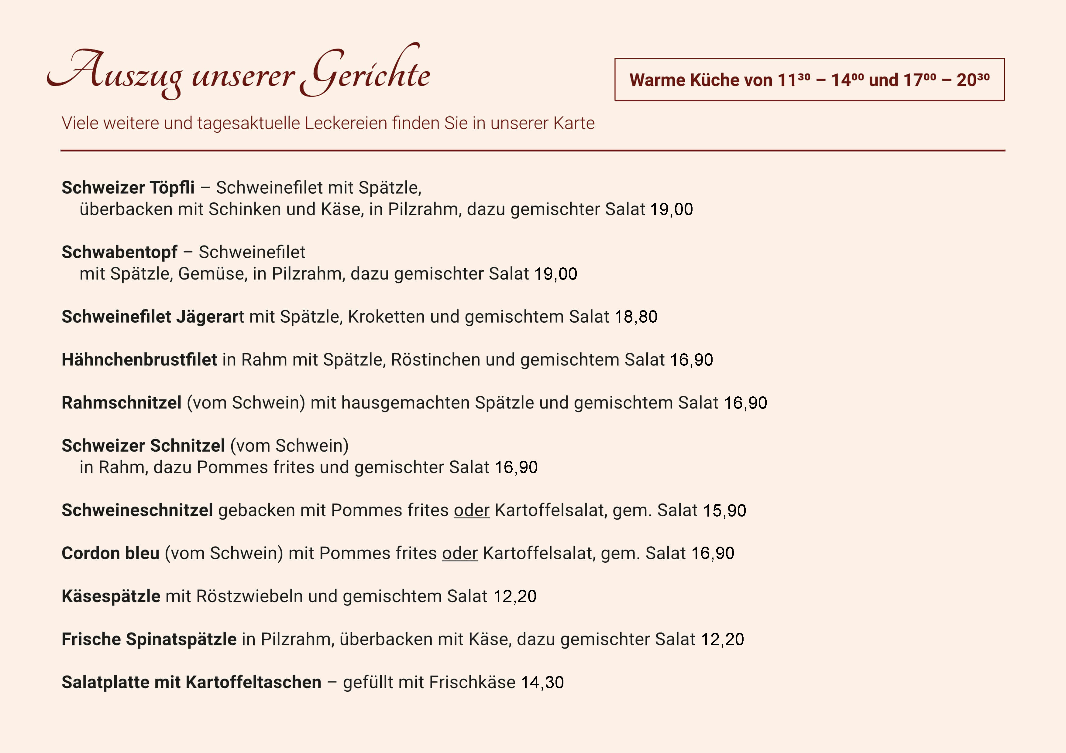 Hier finden Sie unsere Klassiker, sowie ein wechselndes Angebot an schmackhaften Gerichten.